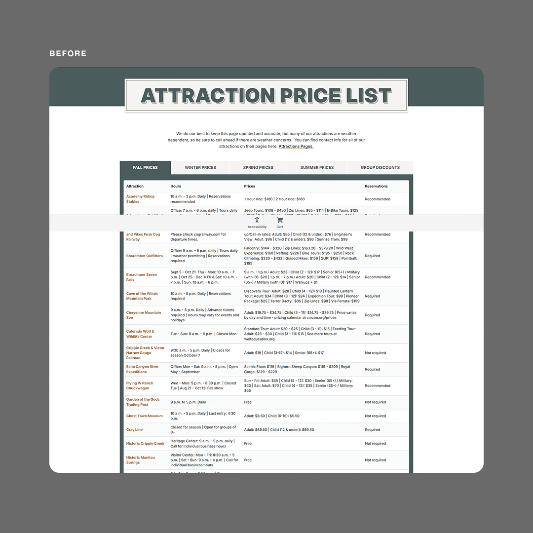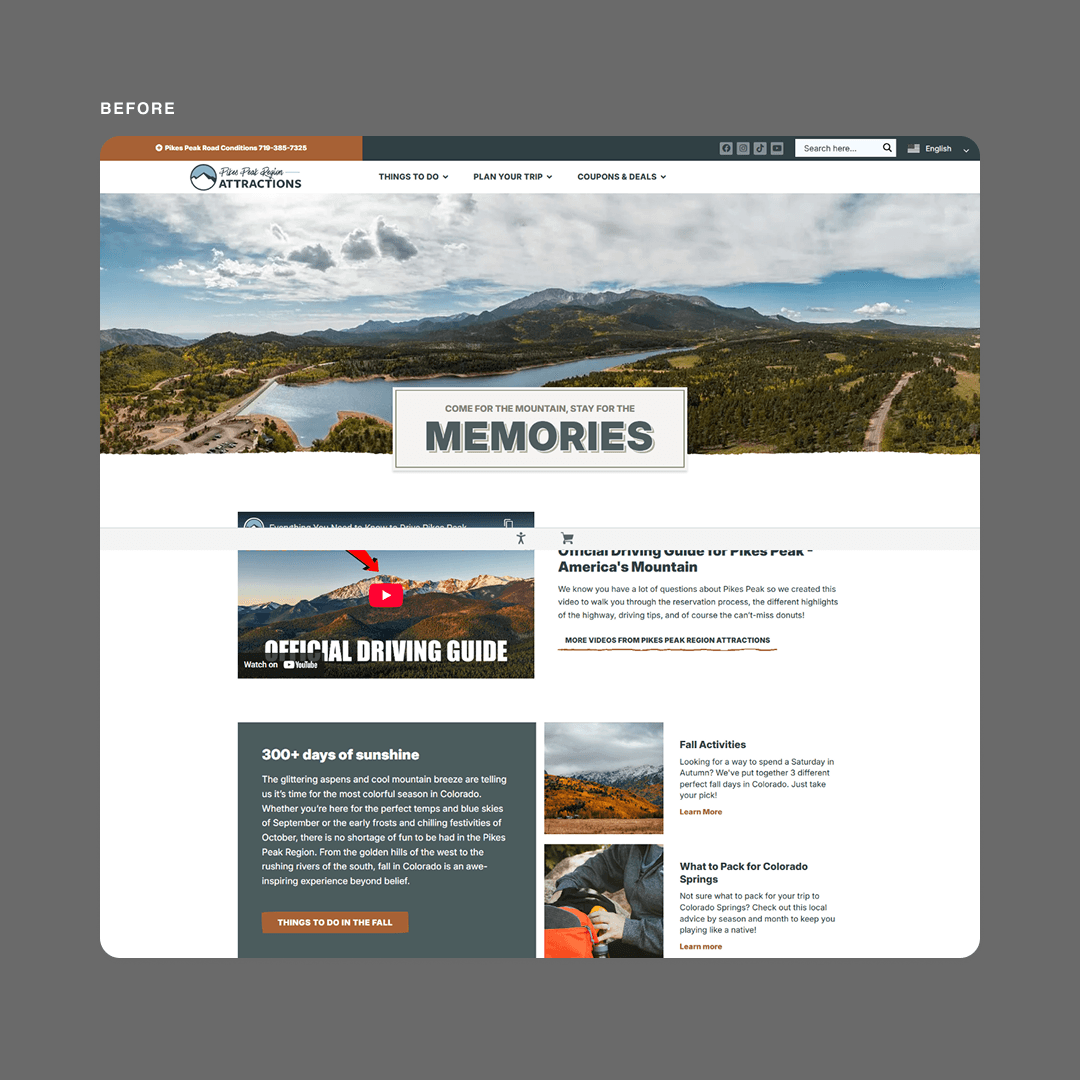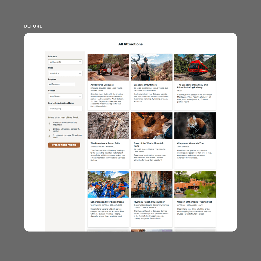 The Pikes Peak region encompasses over 25 unique attractions across multiple communities—from Colorado Springs to Manitou Springs, Cripple Creek to Cañon City. Each attraction was independently run, creating a disjointed user experience with no cohesive visual identity or information architecture.
